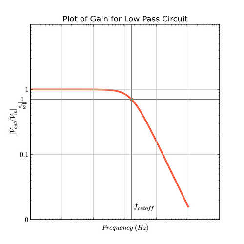 Tenga en cuenta que ambos ejes son escala de registro. Esencialmente esto significa que si se mueve de una línea gris clara al siguiente, su valor realmente aumenta 10 veces. Esto significa que si vieron este terreno sin ejes registro escalado, esencialmente verá una caída casi vertical en la frecuencia de corte. Cualquier señal o componente de una señal que tiene frecuencia más baja que la frecuencia de corte, sin embargo, es sin filtrar, a una buena aproximación.