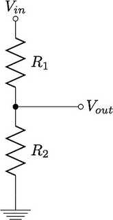 Un divisor de tensión, como su nombre indica, es un circuito que toma un voltaje de entrada y pone una tensión de salida es igual a una fracción de la tensión de entrada. El circuito sí mismo es simplemente una fuente de tensión conectada a dos resistencias en serie, con salida entre las dos resistencias como se muestra a continuación.