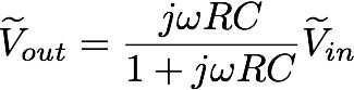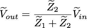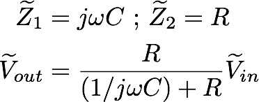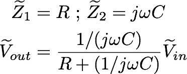 donde Z es sólo la impedancia de los elementos del circuito, y las tildes o líneas onduladas sólo significan nos estamos tratando con números complejos. Para un filtro de paso bajo tenemos una resistencia en la parte superior y un condensador en la parte inferior tan