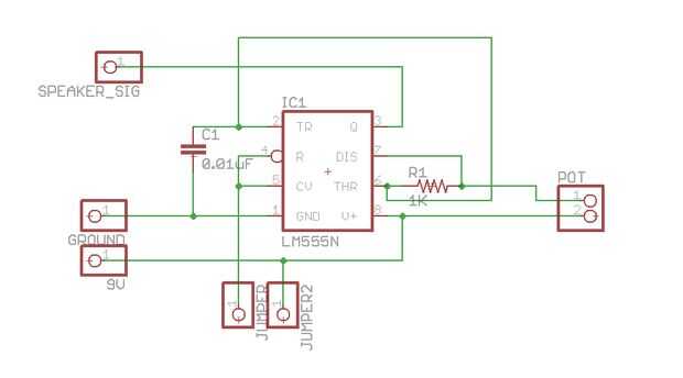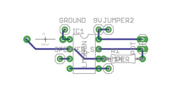 También incluí un puente de alambre en mi circuito, indicado por los dos pernos con "puente" en el esquema arriba. Un puente de alambre es un hilo que conecta una parte de un circuito a otro en caso de que es muy difícil encontrar un camino para en la placa de circuito impreso (PCB). Los pines 4, 5 y 8 debe ser conectado a 9V, pero puesto que están en lados opuestos del Temporizador 555 fue un poco complicados. Como se aprecia en la figura 2, ya tenía rastros conductores ejecuta el temporizador 555, así que tuve que usar un cable de puente para conectar los pines 4 y 5 a 9V sin toparte con otros rastros o tomando un muy largo camino alrededor de la viruta (aunque esto no sea un problema con los rastros de cobre regulares, un largo camino con pintura conductora agregará cierta resistencia innecesaria al circuito).