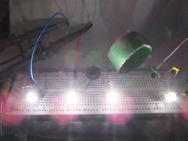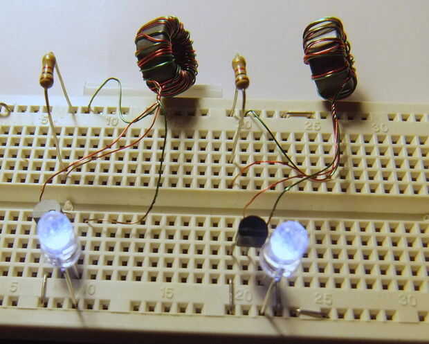 Para ayudarnos a decidir el mejor diseño es importante empezar en igualdad de condiciones, conecté un protoboard a un 1.2v, fuente regulada de 3 amperios con suavizado adicional (el blob amarillo a la izquierda es un 150uF por un 0.1uF condensador). Para los inductores, que he montado 3 bobinas idénticas y ponen a prueba a 100uH, un 2% de cada uno. También estoy usando desechados LEDs de Nichia que limita el color y la intensidad de las variaciones.