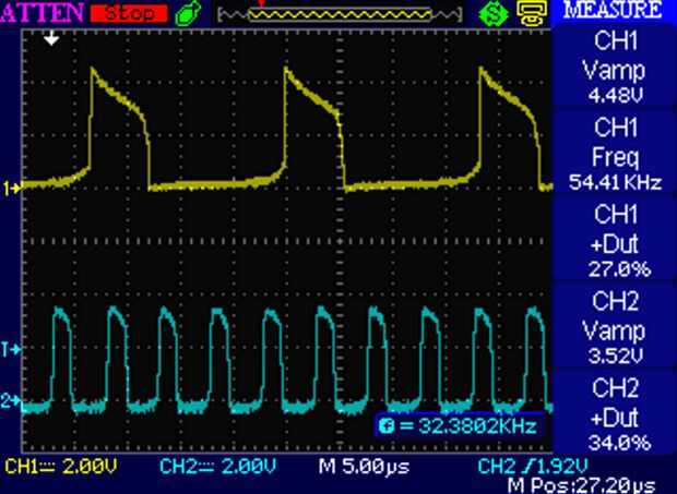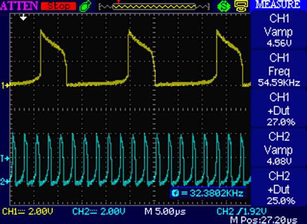 Lecturas de osciloscopio básicos están incluidos, con la parte superior (CH1 / amarillo) trazar siempre mostrar el pulso de salida del circuito "estándar" (#2, que tiene uno de los inductores de 100uH 'emparejados'). Los números relevantes son el V-amp (amplitud) y + Duty (-ciclo); cuanto mayor sea, más luz se produce.