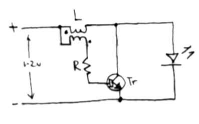 El último circuito es una imitación-JT que sustituye a la bobina secundaria con un condensador y otro transistor, lo que nos permite usar inductores estándares en lugar de enrollar nuestro propio. También ilustra una de las debilidades de la herramienta de medición - a pesar de sus baja QS leer, su salida parece muy brillante. Un vistazo a la última pantalla de osciloscopio (CH2, azul) nos da algunos consejos. En primer lugar, aunque V_amp es sólo 3.52v, su forma de onda es un pico más redondeado en vez de una rápida caída. Otra sugerencia es el + Duty: más es 25% más que el básico JT (34% vs 27%). Recuerde que el tester puede utilizarse para comparar LED y circuitos similares de JT!