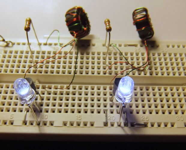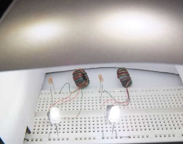 Según estos resultados, salida de 2SD965 debería ser ampliamente superior para el 2N3904 y la imagen siguiente muestra esto. Es aún más evidente si ponemos una hoja de papel encima de las luces, como se muestra en la segunda imagen.