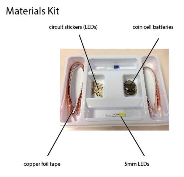 Materiales: Página del circuito de papel (adjunto arriba con o sin interruptor), cinta de cobre de la hoja (si es posible, con adhesivo conductivo), batería de botón, 5mm o el otro tamaño LED, clip pequeño cuaderno, cinta scotch. (Ver segunda imagen de arriba).