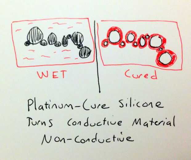 - Interferencia de platino: Este es uno de los problemas más difíciles! A veces técnicas de siliconas de estaño-cura (como baratos Home Depot Caulk) no funcionan para siliconas de curación de la adición más agradables (como cura de platino). Usted puede seguir añadiendo polvo de carbón, y mientras que va a ser conductor cuando aún está mojado, una vez que la silicona de cura, totalmente niega las propiedades conductoras del elemento agregado. Mi conjetura es que de alguna manera la silicona que rodea todas las partículas individuales y aislándolos unos de otros.