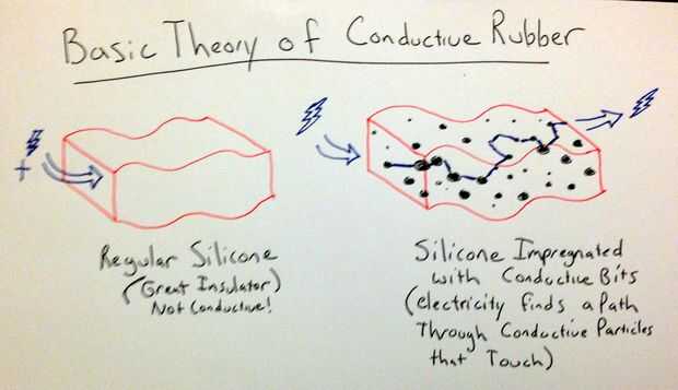La idea básica de silicona conductora es que, mientras que silicona sí mismo es super aislante, puede impregnar con partículas conductoras. A menudo esto se hace con pequeñas partículas de metal o carbono (tiene una distribución decente http://link.springer.com/article/10.1007/s00779-01... ). Por ejemplo personas mezclan de partículas de cobre o plata. Grafito (como en la tinta conductora y pegamento) a menudo en forma de polvo de carbón o negro de carbón es probablemente la más común porque es barato, no tóxico y no corroe.
