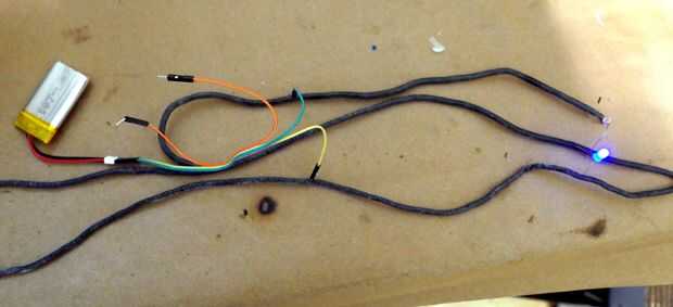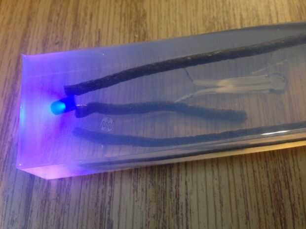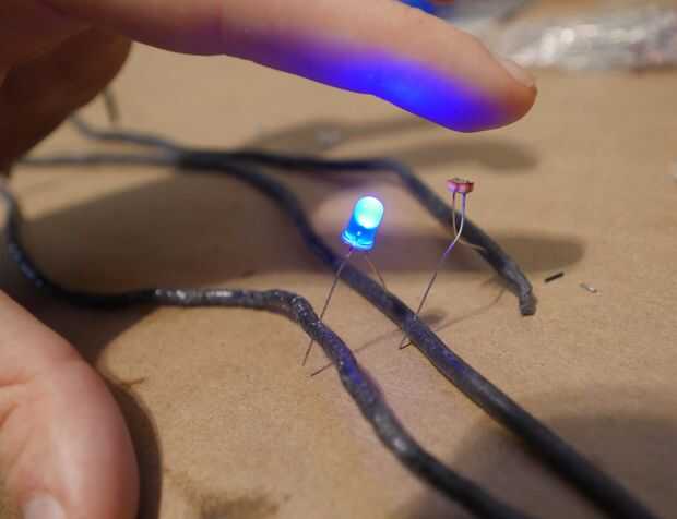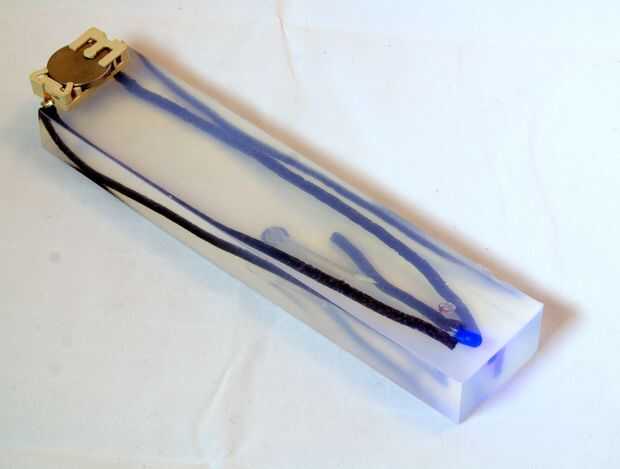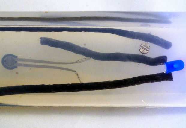 Esto tiene un LED, un sensor de foto y un sensor de presión. Son todos integrados directamente en claro del silicón (aislante) con restos de pasta de goma conductora.