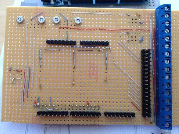 No te limites a una placa del tamaño de tu Arduino. Puede hacer el circuito más grande y poner las clavijas macho en la parte inferior de la placa de circuito para conectar tu Arduino.