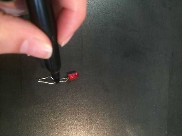 Marque el lado positivo del LED con un marcador. Rizar los cabos en los lazos así que usted puede coser el LED directamente a la tela.
