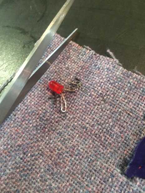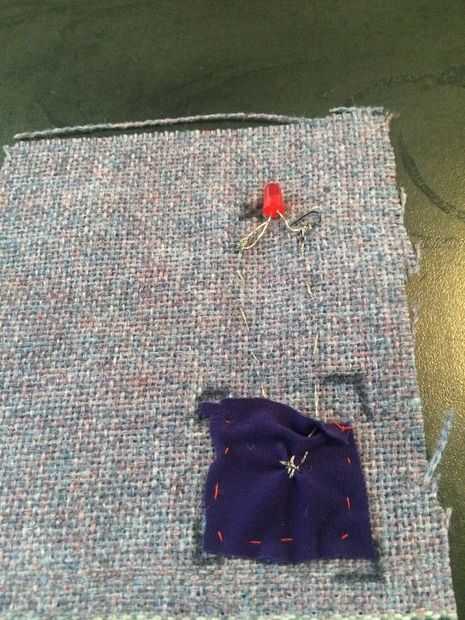 Comience con el hilo que está en la parte superior del bolsillo. Cuidadosamente coser una puntada corriente desde el bolsillo al LED. Asegúrese de no coser el bolsillo cerrado. Coser el LED varias veces para asegurar una conexión. Ate una vez este lado se cose.