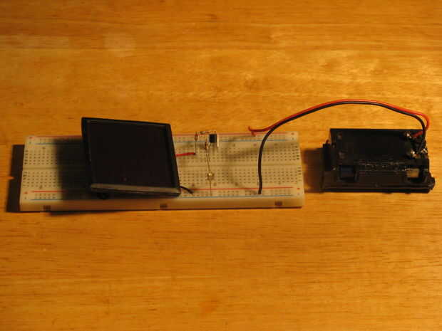 Este circuito funciona muy bien para aplicaciones de baja potencia cuando allí en no actual que sale de la base al daño de la célula solar. Sin embargo con circuitos que producen corrientes más altas que salen de los transistores PNP base, usted puede quemar la célula solar.