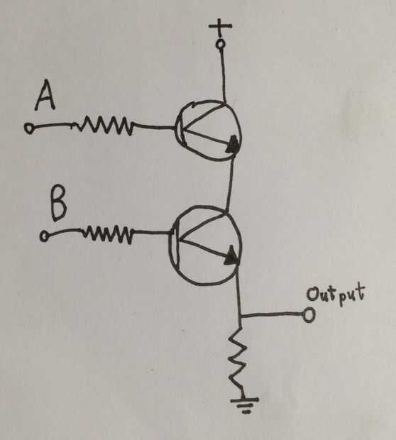 Más puertas lógicas se pueden hacer muy fácilmente con los transistores. En el circuito diagrama arriba usted puede ver una simple puerta y construida usando dos transistores. Sí me doy cuenta de mis habilidades artísticas nunca dejados el segundo grado. En esencia se trata de como dos interruptores cableado para arriba en la serie; corriente no fluye a la salida a menos que ambos interruptores están cerrados. Uso de transistores como interruptores, el circuito puede controlarse completamente electrónicamente.