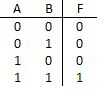 Una puerta y determina su salida por la siguiente regla: si ambas entradas son 1, la salida es 1; Si cualquiera o ambas entradas son 0, la salida es 0 (recordemos que 0 y 1 son "bajos" y "alta" tensión, respetuosamente). La operación se denomina multiplicación booleana porque el resultado es como si "multiplicado" las dos entradas y se escribe también como F = AB, similar a la multiplicación. La tabla de abajo el diagrama se llama una tabla de verdad. Este tipo de tabla enumera todas las combinaciones posibles de entradas y le muestra lo que sería sus salidas correspondientes. Este particular tabla de verdad es para la operación; Observe que la salida es 1 solamente cuando ambas entradas son 1, como era de esperar.