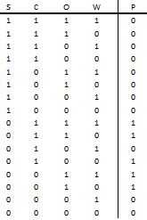 Contamos con cinco líneas con salida de 1. Son: (en el orden S C O W) 0111, 0110,0100,0011 y 0010. Es relativamente sencillo encontrar que la suma de los productos es P = S̅COW + S̅COW̅ +S̅CO̅W̅ + S̅C̅OW +S̅C̅OW̅
