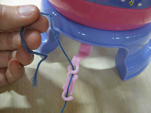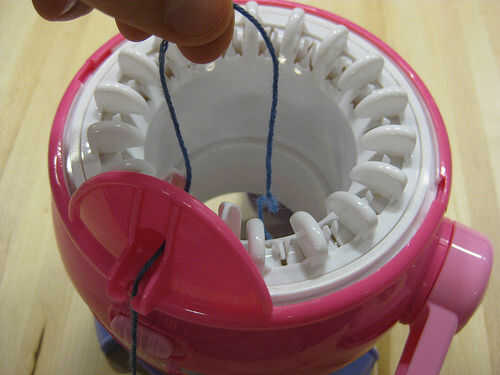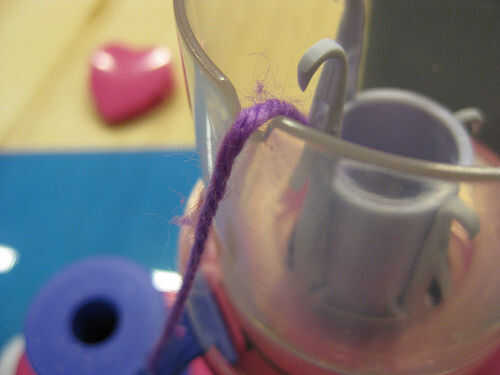 Para empezar, pase el hilo a través de la plataforma de tensión y a través del agujero en el centro de la máquina de tejer. Durante el proceso de todo punto, si la máquina hace ruidos extraños, compruebe que el hilo es capaz de correr a través de la tensión del aparejo con ninguna fricción adicional, necesidad de relajarse a sí mismo de la bola del hilado puede ser a veces demasiado peso de la máquina y le ayudará si usted relajarse la bola de hilo para que puede alimentar el hilo en la máquina con facilidad absoluta.