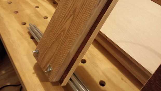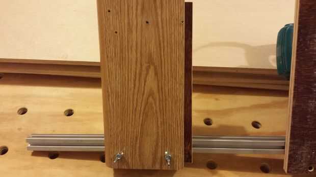 El montaje de la guía tiene dos partes, la valla es una pieza de 1" MDF, la madera en forma de L es un trozo del vio la base, que es ¾" desplazamiento a la derecha de la valla como un espaciador para la barra de aluminio de 80/20 se mantiene nivel y también crea una esquina de 90 grados en el lado de la cerca para que monta firmemente contra el borde de la madera cuando hay una hacia abajo y lateral presión aplicada.