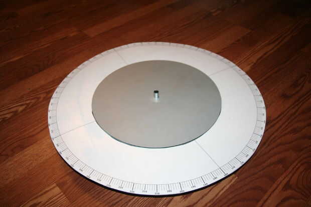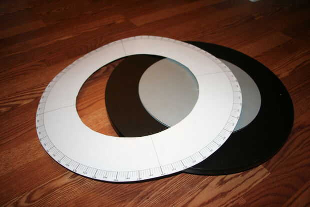 El siguiente paso fue crear un círculo de grados para imprimir. Hay unos flotando en la internet, pero me decidí a utilizar Adobe Illustrator para crear mi propio. Creó para ser 21" en diámetro y tiene un pequeño guión para cada 1°, un guión largo para cada 10° y un número cada 5°.