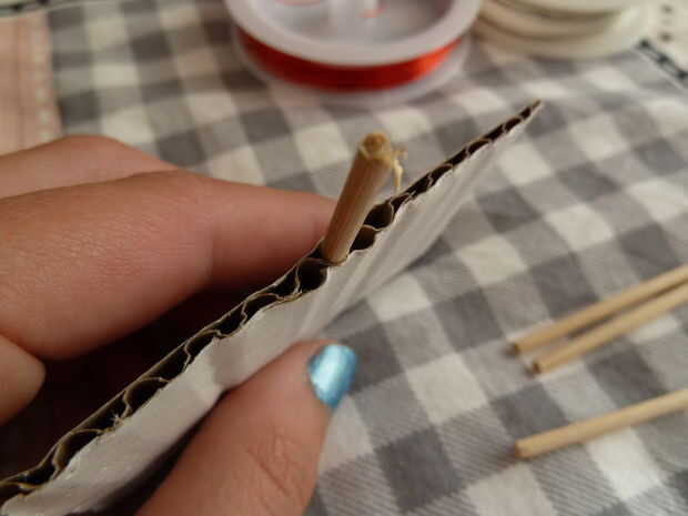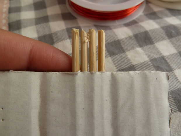 Corte el pincho de bambú en cuatro pedazos. Añadir las piezas a la cartulina como se muestra en las fotos.