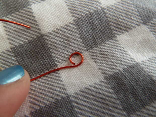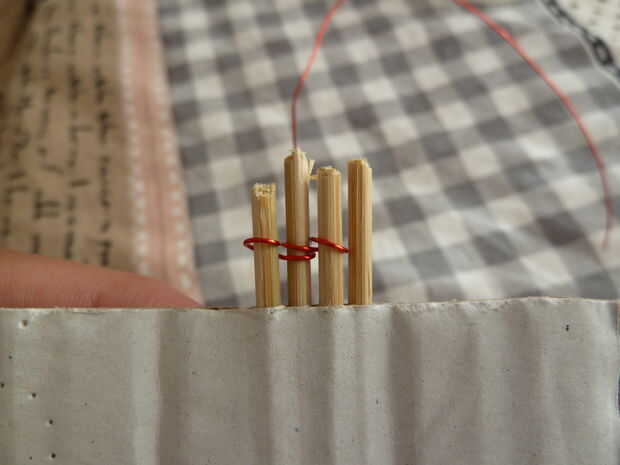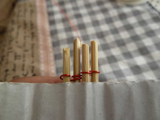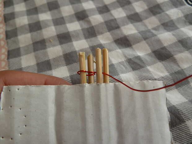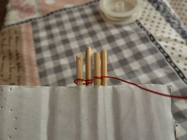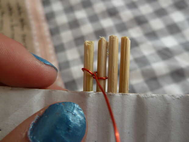 Hay que empezar con hacer un bucle que se coloca sobre el pincho de bambú. Luego, enrolle el cable alrededor de los pinchos de bambú como se muestra en las fotos.