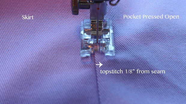 -Presione abrir la pieza del bolsillo y pespuntear 1/8" en de la costura hacia el bolsillo, esto creará el bolsillo para poner el plano hacia el interior de la falda.