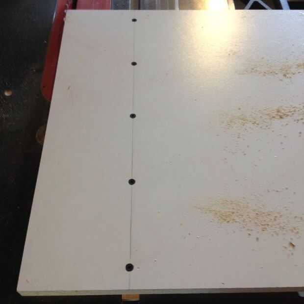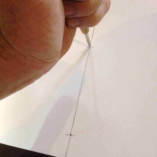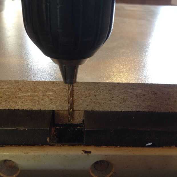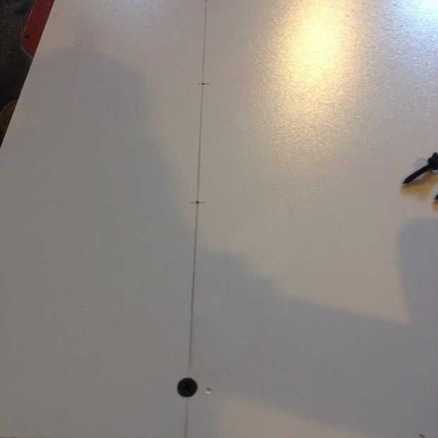 Dejamos la barra un poco más de la superficie de trabajo para que más fácilmente podríamos detectarlo por debajo. Esto hará más fácil perforar los agujeros de fijación. Mida y marque la superficie de trabajo con una línea de derecha por el centro de la barra guía. Utilizando un punzón, marque la ubicación de cuatro o cinco agujeros. Si la broca es bastante corta, coloque lo suficiente en la tirada del taladro que no llegó a la mesa. Si su demasiado largo, envolver un trozo de cinta alrededor de la broca para marcar la profundidad adecuada.