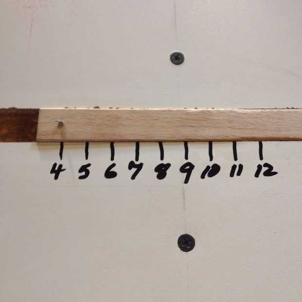 La rueda más pequeña que le corté con esto es 4" de diámetro. Más pequeñas y los dedos están bastante cerca de la hoja. Medir dos pulgadas desde el lado de la lámina de la superficie de trabajo y haga una marca. Esto representa el radio de la pieza a cortar (la rueda). Marqué mi cada ½". No olvide, cada ½" de radio igual a 1" de diámetro del producto final.