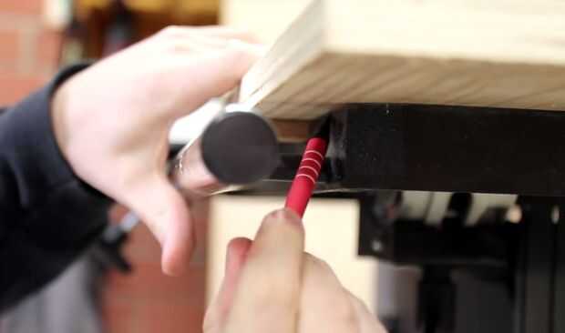 Mientras el trineo está en la sierra con la hoja en la posición más alejada, la marca bajo el trineo donde se golpeó la mesa.