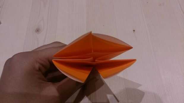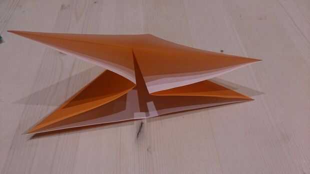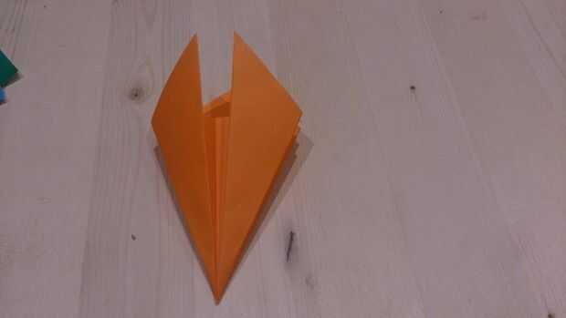 En primer lugar, hacer sus dobleces básicos como se muestra en la primera foto. Luego, dobla el papel por la mitad y doblar los bordes. Después de doblar los bordes del triángulo para arriba en ambos lados. Sería algo así como una cabeza de zorro. Hacer 8 de estos.