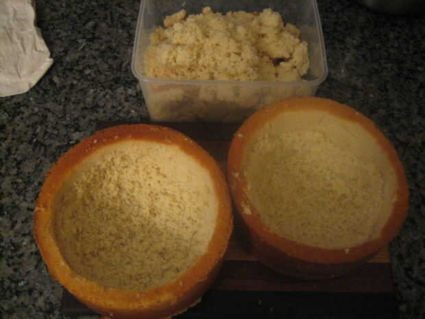 3. ahora comenzar a cavar. He preferido hacer esto con mis manos como pude suave rascar las tripas de la torta hacia fuera sin estropear el pastel entero.