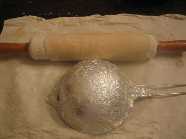 1. Tome un pedazo de papel, de aproximadamente 12" cuadrados y utilizarlo para cubrir el exterior de la cúpula del tamiz. Doblar los bordes de la hoja en el vaso del tamiz. Precalentar el horno a 350.