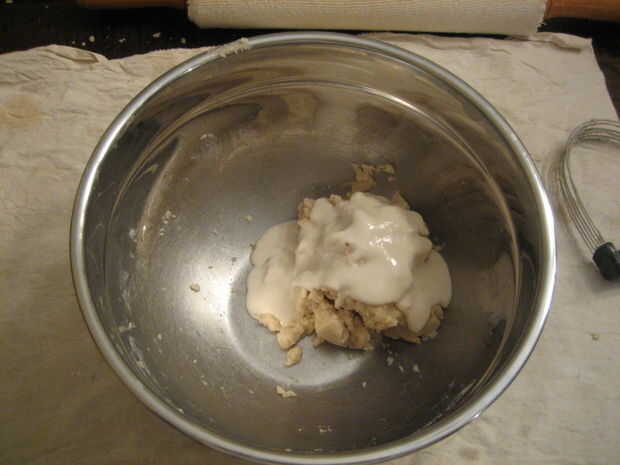 10. Añadir 1/4 c de agua helada a 1/3 taza de harina para hacer una pasta. Añadir la pasta de harina a la bola amasada.