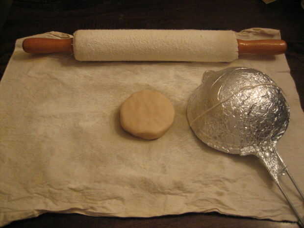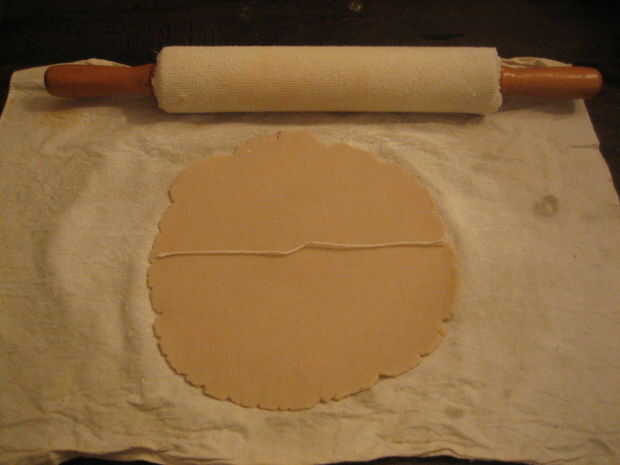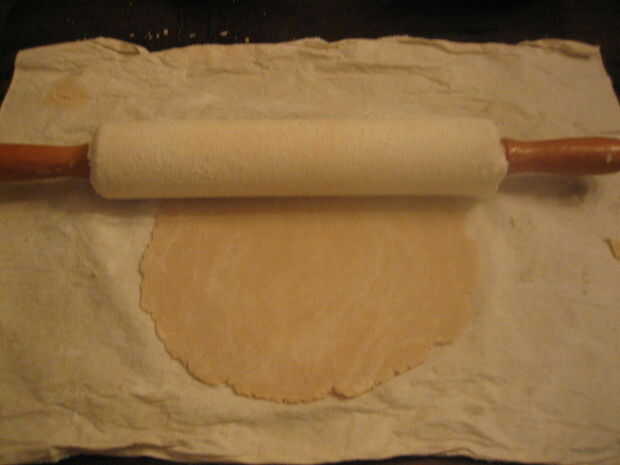 12. enharinar el rodillo y la superficie rodante. Cubrir una mitad de la masa con algunos harina y dar forma a un disco. Rodillo la masa hacia fuera en un círculo con un diámetro que coincide con la longitud de la pieza de hilo.