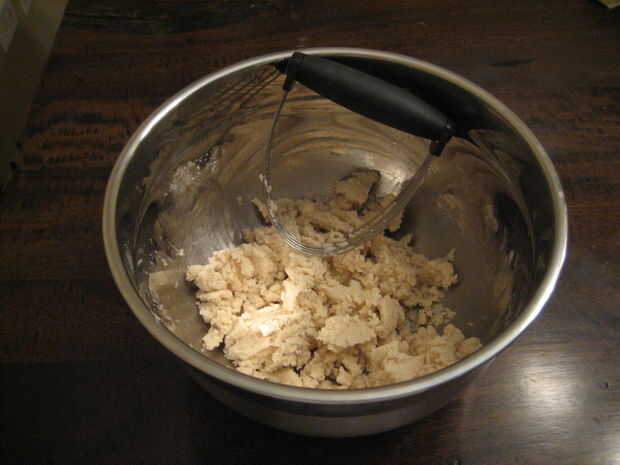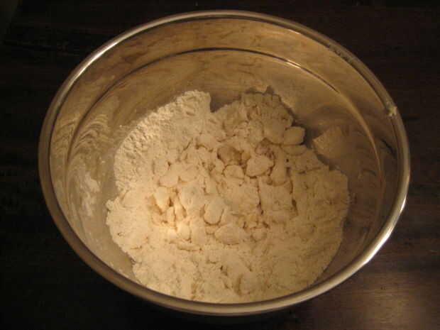 8. cortar con un cuchillo hasta que el Crisco es decentemente cubierto de harina.