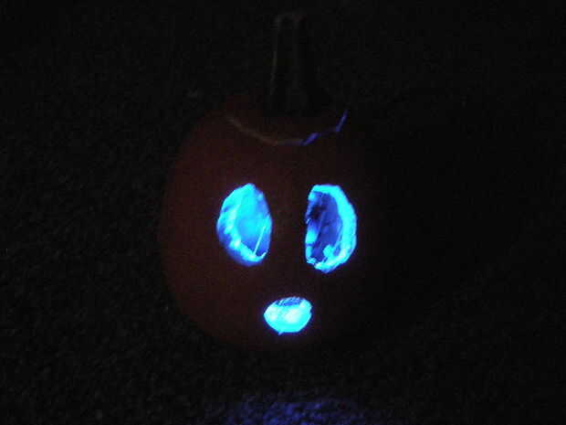Posición del cerebro dentro de la calabaza con el LED frente a la cara. Si tienes un interruptor de láminas, agoten los cables al lado del tallo, en el lado hacia la cara.