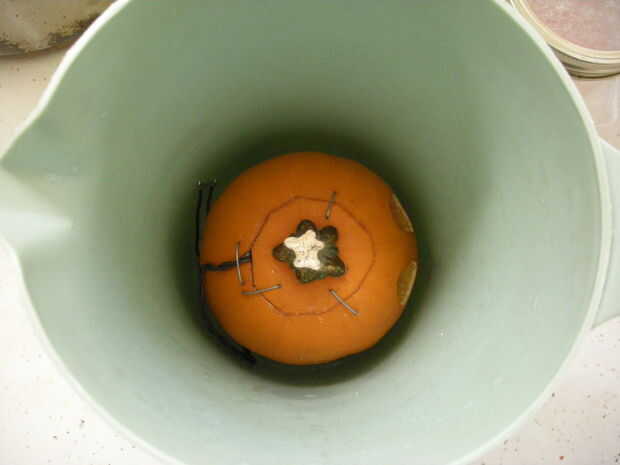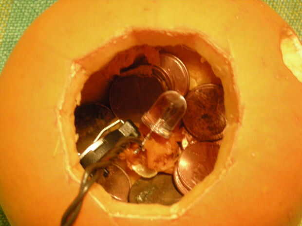 Mientras esperamos para que congelar la parte inferior, preparamos la calabaza para su preservación. Porque flotan calabazas, cubrir la parte inferior de la calabaza con la mayor parte de o todo un rollo de monedas. Tenga cuidado de que no alteran el cerebro artificial si usted optó por utilizar un interruptor en el tuyo.
