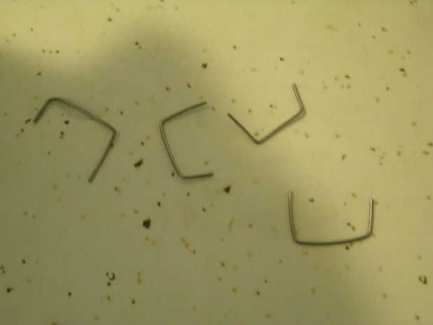 A continuación, hacer una pequeña colección de quizás una docena de grapas de cucurbita . Estas son piezas cortas de cable o tal vez clip, formado en una forma de "U" angular con los alicates. Utilizarlos para garantizar el tallo de la calabaza principal por lo que no flota, para fijar el cerebro artificial y para frenar los cables perdidos. Probablemente será necesario utilizar pinzas para insertarlos en la calabaza también.