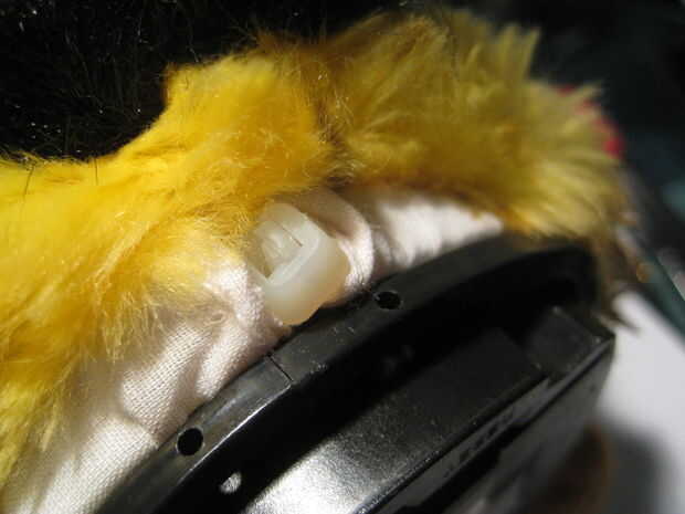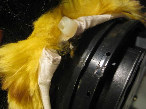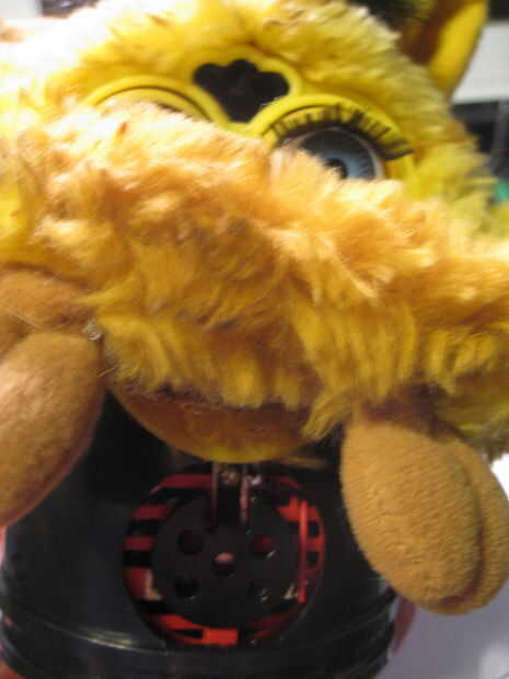 Piel de Furby tira como un calcetín, o camisa de una persona, hasta llegar a su cara.