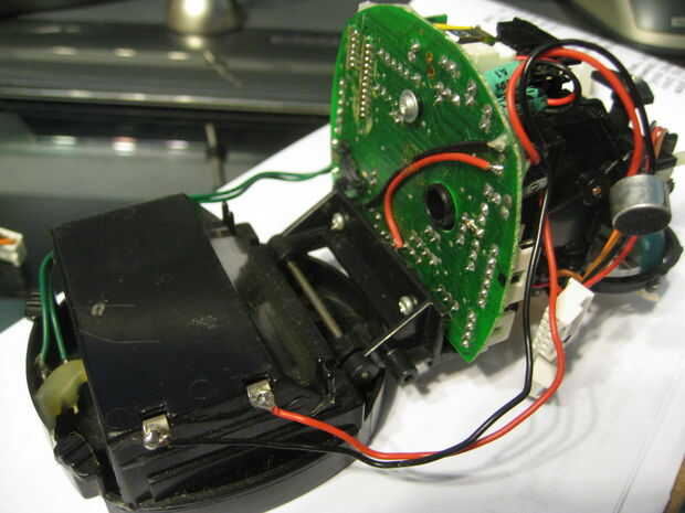 En el lado derecho, desconecte la lengua / engranaje codificador interrupción cables (ed, negro, marrón, naranja cables todos torcidos juntos) y el IR, enviar y recibir y los cables del sensor de luz (rojos, negros, marrón, naranja, amarillo y verdes los cables todos torcidos juntos). Esto libera las líneas de energía, dos cables que son rojo y negro y ejecución para el compartimento de la batería.