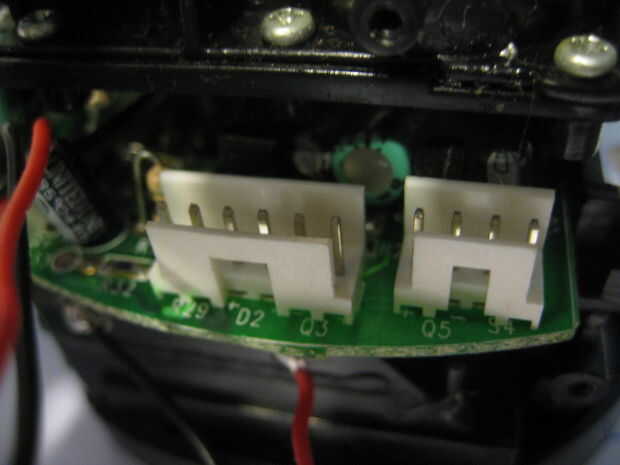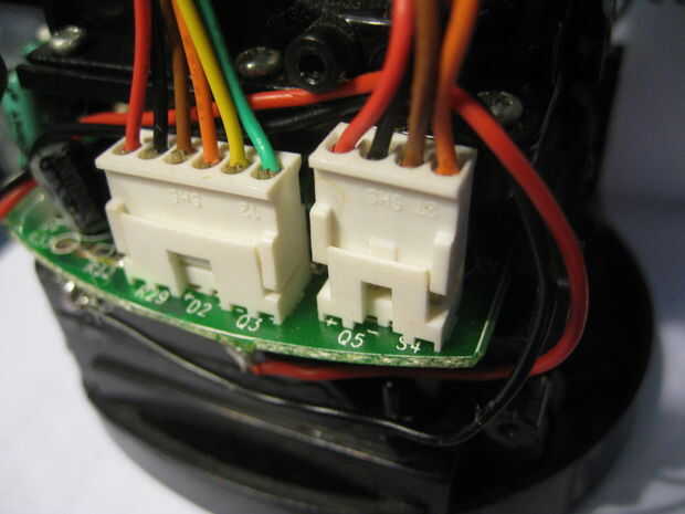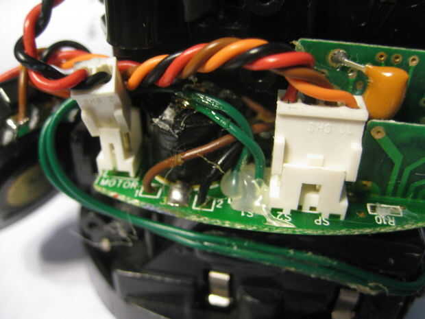 En el lado izquierdo, desconecte el sensor del altavoz y del vientre (rojo, negros, marrón, naranja cables todos torcidos juntos), luego desconectar el motor (rojo y negro). Ambos de estos deben ser desenchufados para liberar los dos cables verdes, conectados al área de "S1", que van en el botón RESET debajo de la cola de Furby.