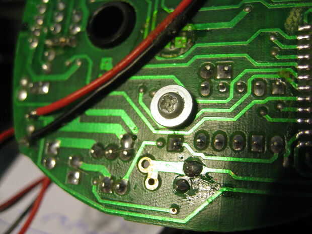 Sigue siendo sólo un tornillo - lleva a cabo la Junta para lo que resta de Furby esqueleto y engranajes etc, que llamaremos su "movimiento". Este tornillo es distinto a los demás en que tiene un plástico stand-off, como una arandela pequeña. Afloje este tornillo.