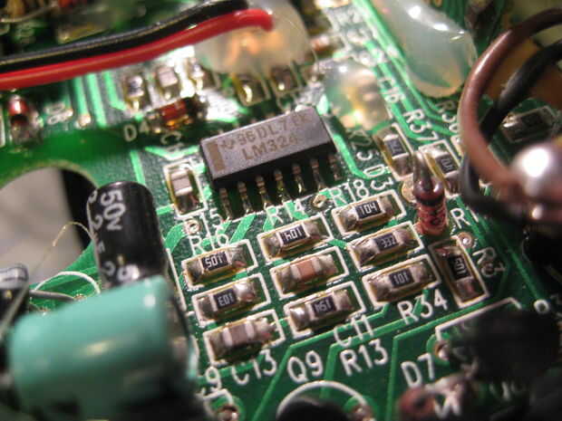 Junto a una pequeña red de resistencias es un comparador cuádruple - esto es para el comunicación sensor/emisor de infrarrojos y micrófono de oído primitivo del"" de Furby.