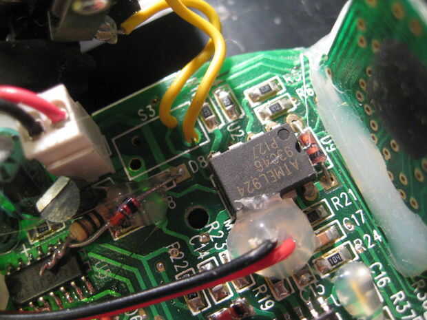 Cerca, hay una EEPROM - esto es donde "memoria" de todo Furby - no es memoria en el sentido de la arquitectura de computadora, pero "Memoria real" de Furby que incluye su nombre, las palabras que él aprendió y uso de la voz el chip de síntesis de voz.