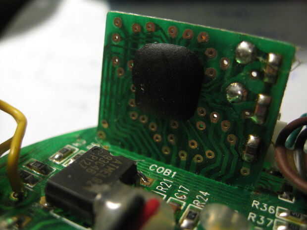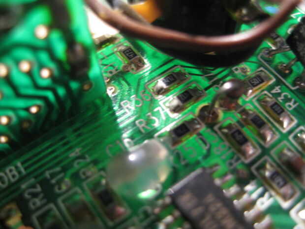 Nota de HACKING : justo al lado de la inclinación sensor es algo muy importante - R36 y R37. Estas son las resistencias para el control de motor de Furby. Si desea controlar el motor de Furby y no desea eliminar de su cerebro y también quieren construir su propio puente de H, se trata de donde perforar - del procesador principal al motor, son antes de puente en H de Furby, cuyos transistores se puede ver alinean al borde delantero de Furby. Si nada de eso tenía sentido para usted, simplemente ignore este párrafo entero.