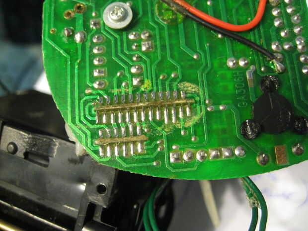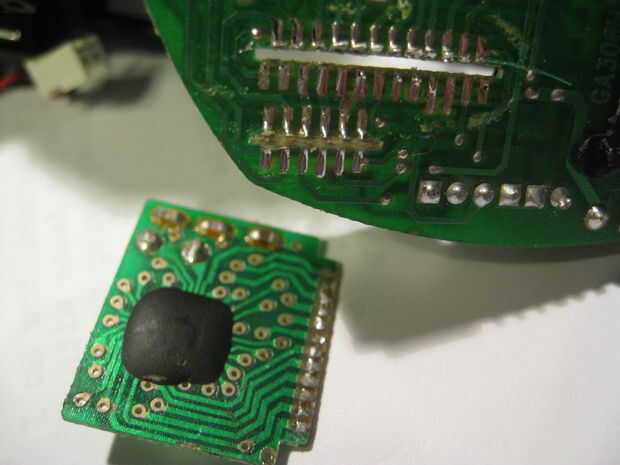 Tenga en cuenta que aunque ambos chips personalizados están cubiertos con un goo negro para protección de copia, ambos tienen contactos del abrir-agujero para cada pin, posiblemente para las pruebas en la fábrica. Si querías ser bastante locos, supongo que de alguna manera podría desactivar el procesador y use estos agujeros como contactos fácil para evitar el dolor de volver a soldar todos estos pernos pequeños. Pero estoy haciendo esto la manera dura: