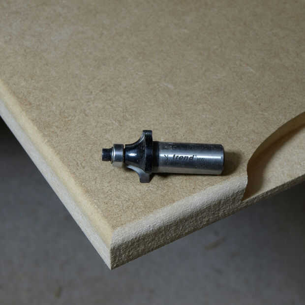 Para una mirada limpia, contemporánea, utilice un cojinete de guía redonda sobre cortador en el router, para crear una ronda sobre el borde delantero de la puerta.