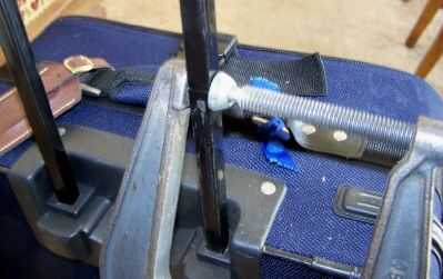 Con un pequeño músculo pudo extender el mango completamente. Había un bulto en el lado del tubo más pesadamente dañado cuando está completamente extendido. Apreto el bulto detrás en a plana como sea posible con una abrazadera de "C". También usé los pedazos de madera y la abrazadera de "C" para enderezar este tubo. Los anteriores intentos de enderezar tuvieron un efecto positivo en el tubo dentro de la maleta, pero este tubo en su interior todavía estaba doblado un poco.