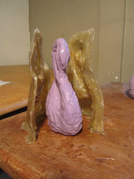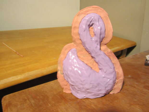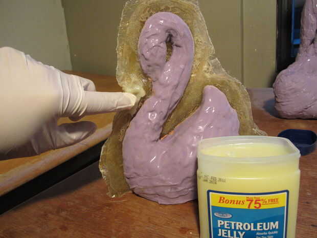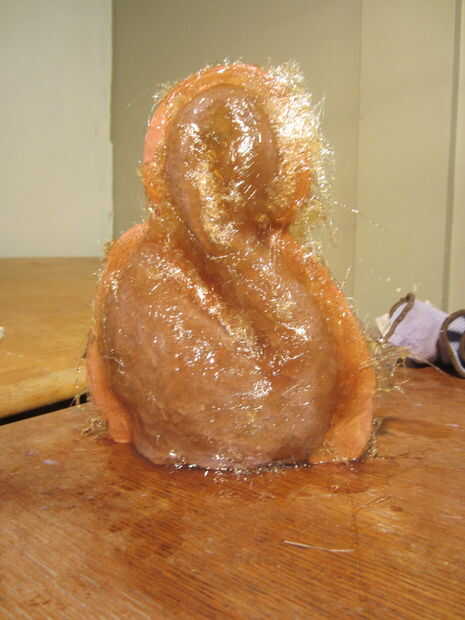 Hacer un molde de la madre para el molde del caucho de silicona. Esto es necesario para mantener la forma del cisne cuando el material se vierte en el molde para hacer una copia del cisne. El molde de la madre está hecho de fibra de vidrio y resina de fibra de vidrio comprado en Home Depot. Sus cosas realmente tóxicas tan use equipo de protección personal como guantes, gafas protectoras y un respirador.