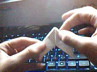 Ahora, cuando listo con eso, agarra la parte superior con los dedos y doble hacia abajo. Cuando usted lo hizo, usted comenzará a ver los primeros signos del cisne que estamos haciendo.