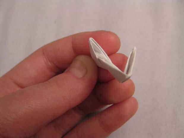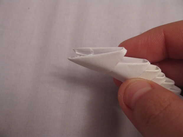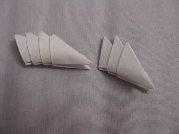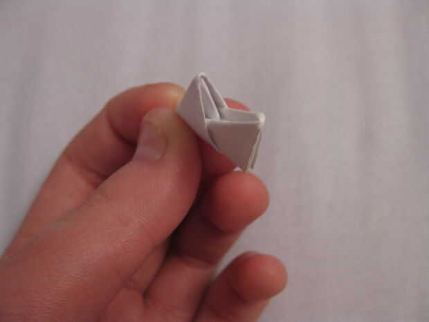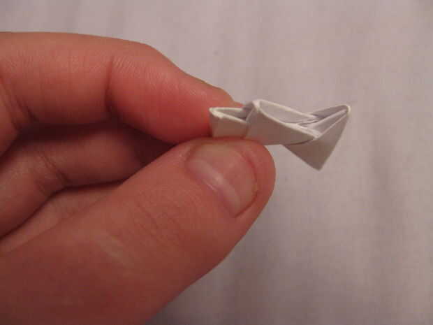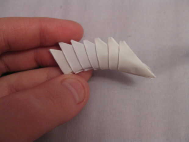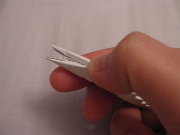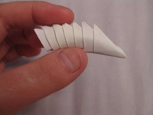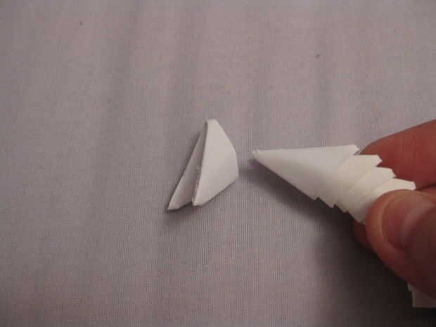 A pila, puntos de ranura los dos de un triángulo en los bolsillos del otro triángulo. Continuar por unas pocas piezas y una vez que se expanden en tamaño, tomar los triángulos sin abrir desde el extremo y agregarlos al frente. Esta manera, usted tiene un palo de triángulos totalmente abiertos.